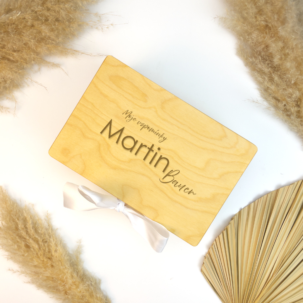 Díky jemnému přírodnímu provedení, gravírování a bílé mašli se krabička stává elegantním doplňkem i originálním dárkem. Je ideální pro všechny, kdo chtějí své nejkrásnější chvíle uchovat stylově, přehledně a s osobním dotekem.
