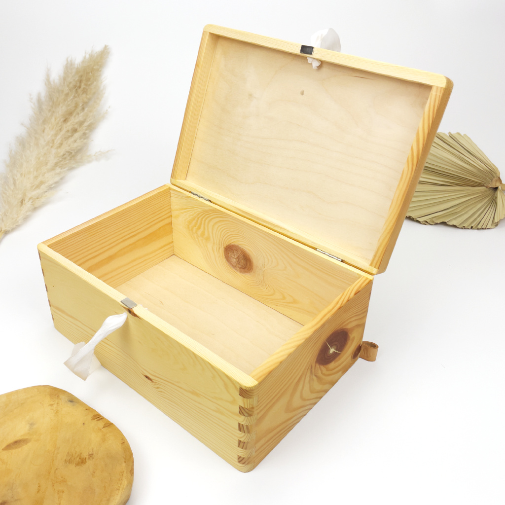 Tato elegantní dřevěná krabička je ideální pro uchování fotografií, dopisů, drobných pokladů nebo vzpomínek na důležité životní okamžiky. Minimalistický design doplněný jemnou bílou mašlí působí nadčasově a krásně se hodí do každého interiéru.