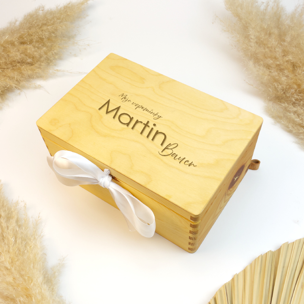 Dřevěná krabička na vzpomínky s gravírováním jména je krásným a osobním místem pro uchování vašich nejcennějších vzpomínek. Díky gravírování jména a motivu Moje vzpomínky vznikne jedinečný personalizovaný dárek, který má skutečnou hodnotu a vydrží jako památka po mnoho let.