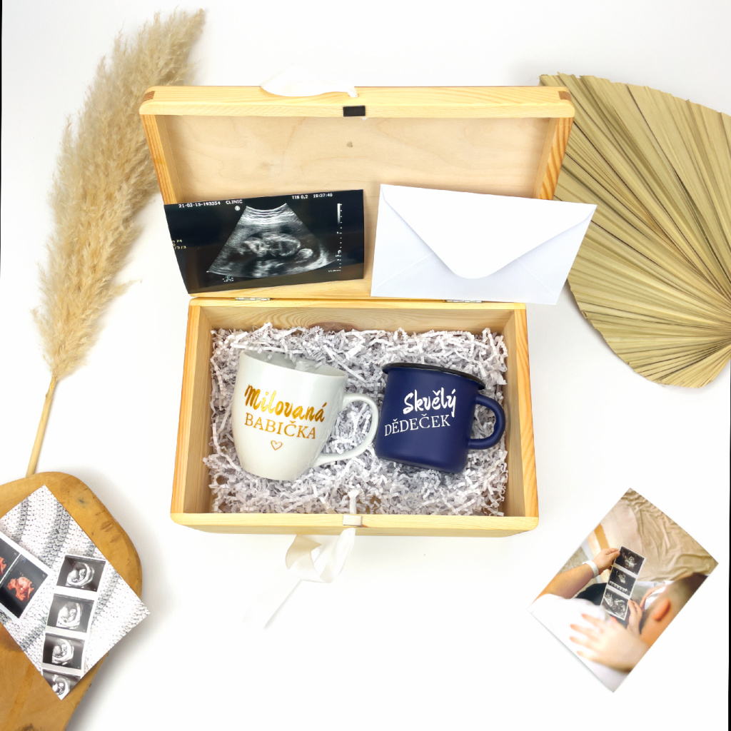 Stylová dárková krabička ukrývá dva hrnečky s nápisy Milovaná babička a Skvělý dědeček, elegantní dřevěnou krabičku na vzpomínky a obálku na první ultrazvukovou fotografii miminka.