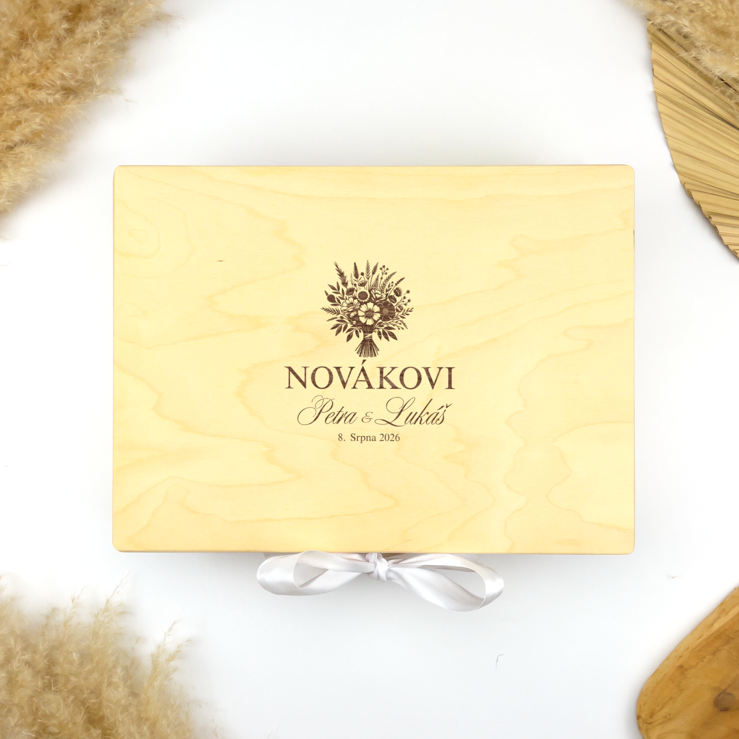 Elegantní dřevěný box s jemnou bílou mašlí a gravírováním na míru. Nechte na víku zazářit jména novomanželů nebo datum svatby a vytvořte tak originální památku na jejich velký den. Krabice může sloužit jako stylové balení svatebního daru, místo pro uchování vzpomínek – fotek, přání či sušených květin, nebo jako box na dopisy od hostů a první společné poklady novomanželů.