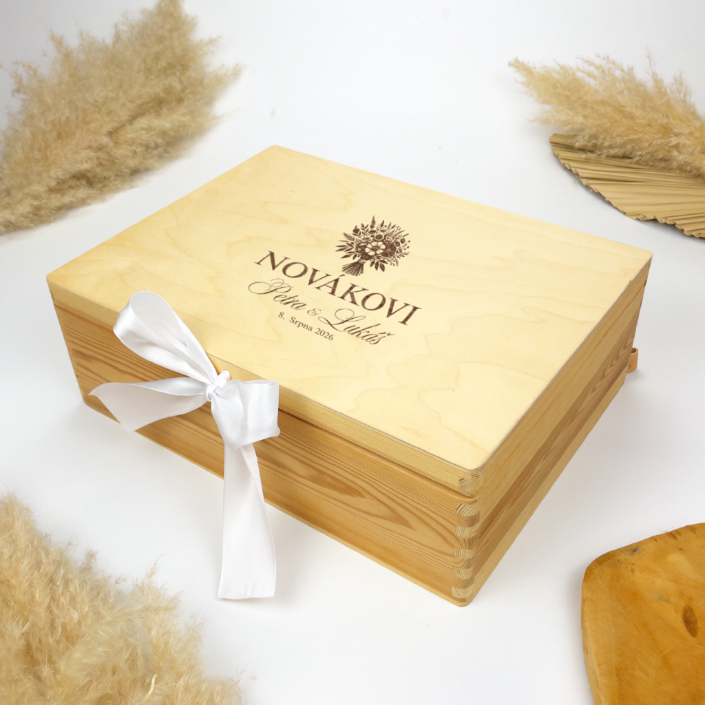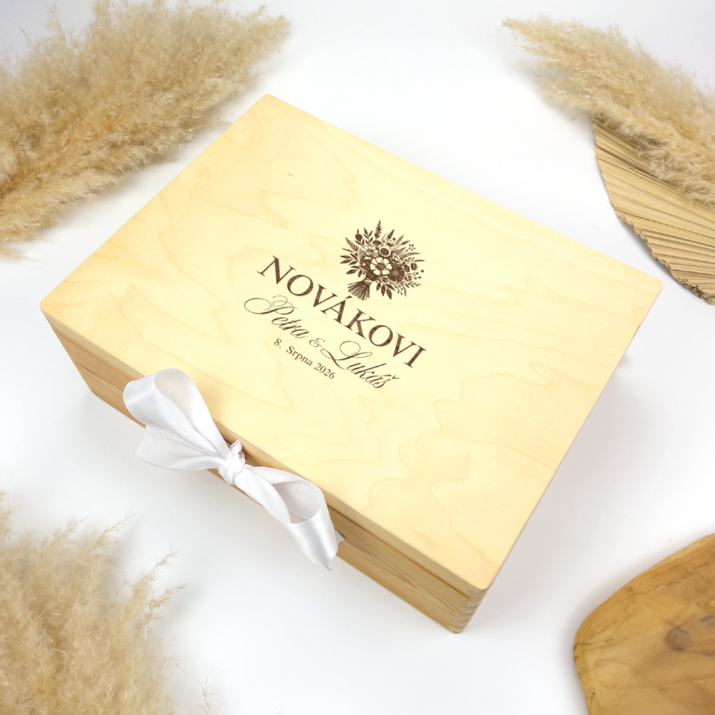 Elegantní dřevěný box s jemnou bílou mašlí a gravírováním na míru. Nechte na víku zazářit jména novomanželů nebo datum svatby a vytvořte tak originální památku na jejich velký den. Krabice může sloužit jako stylové balení svatebního daru, místo pro uchování vzpomínek – fotek, přání či sušených květin, nebo jako box na dopisy od hostů a první společné poklady novomanželů.