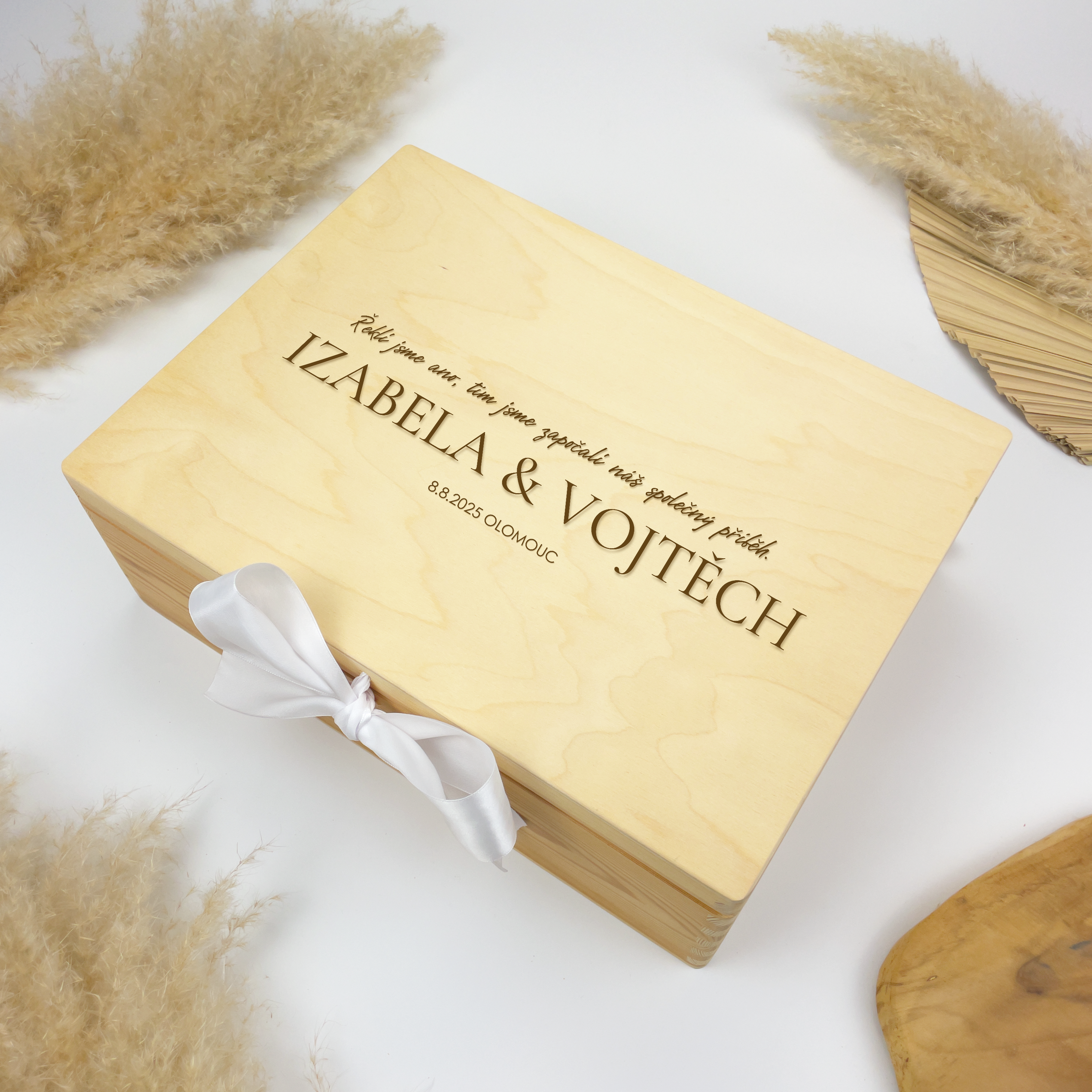 Elegantní dřevěný box s jemnou bílou mašlí a gravírováním na míru. Nechte na víku zazářit jména novomanželů nebo datum svatby a vytvořte tak originální památku na jejich velký den. Krabice může sloužit jako stylové balení svatebního daru, místo pro uchování vzpomínek – fotek, přání či sušených květin, nebo jako box na dopisy od hostů a první společné poklady novomanželů.