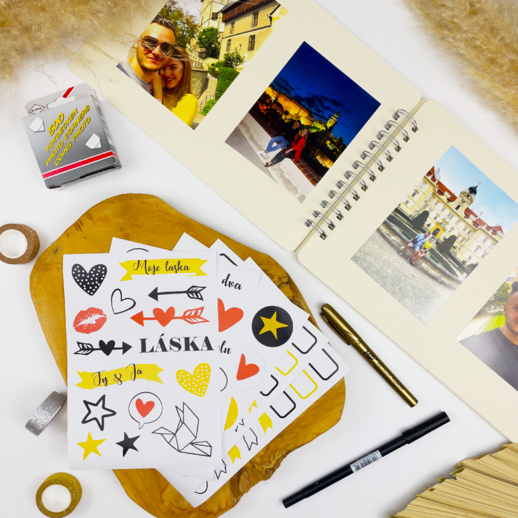 Součástí alba je 5 archů tématických samolepek, které ti pomohou dozdobit Vaše fotky i vzpomínky. Vytvořte si tak společně originální album plné lásky, emocí a osobních detailů, ke kterému se budete rádi vracet