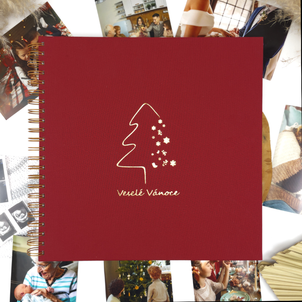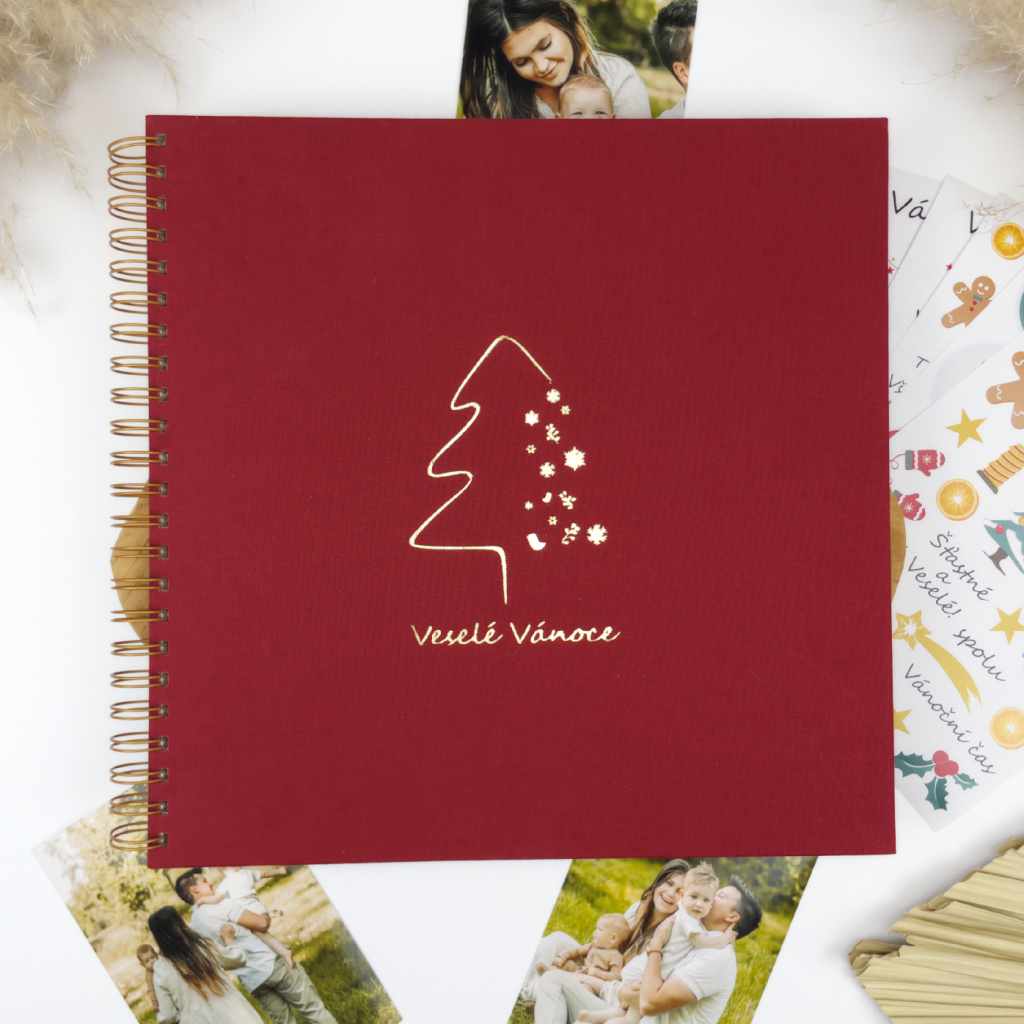 Velké fotoalbum ve vánoční vínově červené barvě má čtvercový tvar a velikost 30x30 cm. Album je potaženo červeným plátnem a ozdobeno jemnou zlatavou ražbou vánočního stromečku a nápisu Krásné Vánoce.