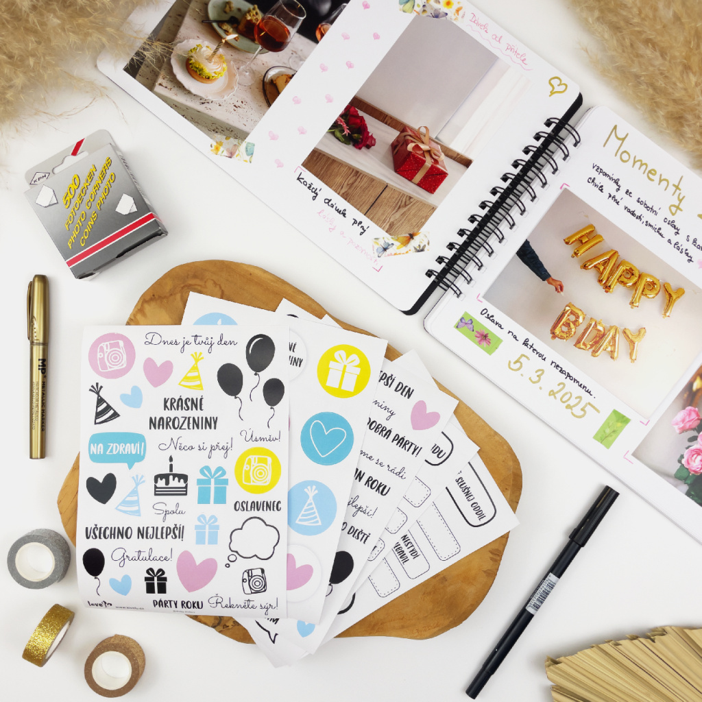 Navíc k albu dostaneš sadu 5 archů samolepek. Díky nim, můžeš fotky dozdobit a dát do nich i kousek sebe. Takto budou vzpomínky ještě krásnější:)
