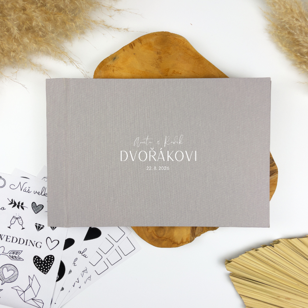 Šedé svatební fotoalbum působí čistě, moderně a velmi elegantně. Obálku zdobí personalizovaný bílý nápis - jméno, datum nebo krátký text - díky kterému se z alba stává originální svatební kniha hostů i nezapomenutelný svatební dar pro novomanžele.
